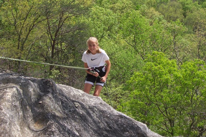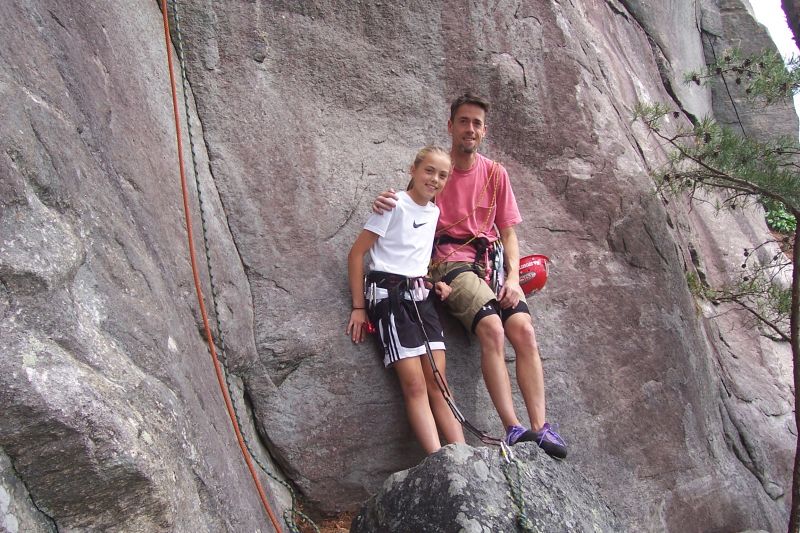 Scout got to go on her first Multi-Pitch climb today. After winding our way through the maze of trails left by "the pad people", we found the target area on the wall, and Andy led Bear Hunt ( or some variant thereof) 65 feet to the first tree ledge, then the rest of us followed. After a brief snack, Andy continued up on Gift Certificate (130ft) to the next tree ledge. Meanwhile, Calhoun was lowering Scout back to the ground so she could retrieve his helmet and gear, and upon her return she roped up to follow Andy. Robert was kind enough to take another belay as Calhoun then led The Gift (130ft), ending up at the same ledge where Andy and Scout were waiting. Calhoun then belayed Robert. After a few moments enjoying the view of Lake Lure and Chimney Rock, they all rapped off in succession, then suffered through some top-roping of Fine Line. We had a great day, just missing the thunderstorm that rolled in on our hike back to the car.